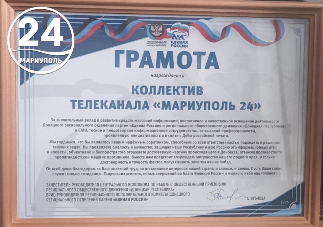 Представители регионального отделения партии «Единая Россия» вручили грамоту коллективу телеканала «Мариуполь 24» за значительный вклад в развитие средств массовой информации и в связи с Днем российской печати.