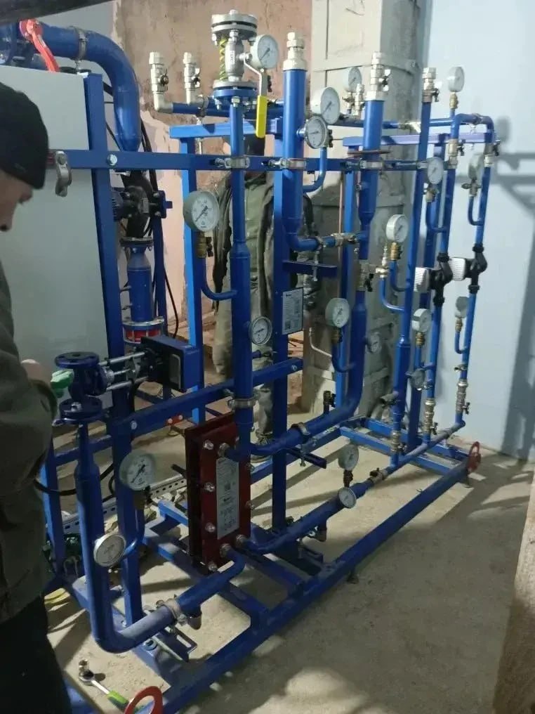 Специалисты проводят демонтаж стяжки в сауне, монтаж оборудования индивидуального теплового пункта (ИТП), прокладку труб горячего и холодного водоснабжения, отопления.