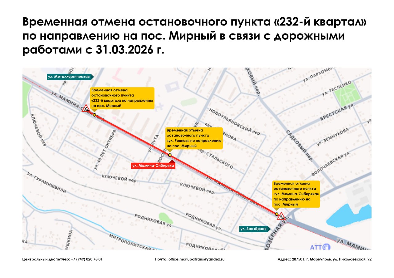 Информируем, что с 31.03.2026 г. в связи с дорожными работами по ул. Мамина-Сибиряка, остановочный пункт «232-й квартал» по направлению на пос. Мирный временно отменяется.