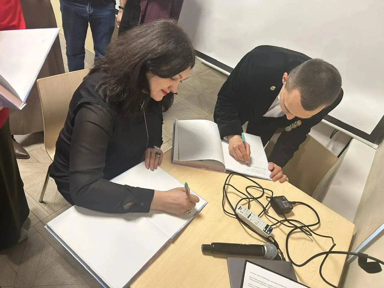 Презентовали книгу автор и редактор, член Союза журналистов России в ДНР, помощник ректора ДонГУ Наталия Москаленко, рецензент профессор МГУ имени М.В. Ломоносова, заместитель декана исторического факультета по научной работе Дмитрий Андреев, соучредитель БФ "Русская миссия" Даниил Щипков, директор БФ "Русская миссия" Наталья Щипкова и ветераны боевых действий, выпускники ДонГУ Владимир Сухинин и Михаил Третьяков.