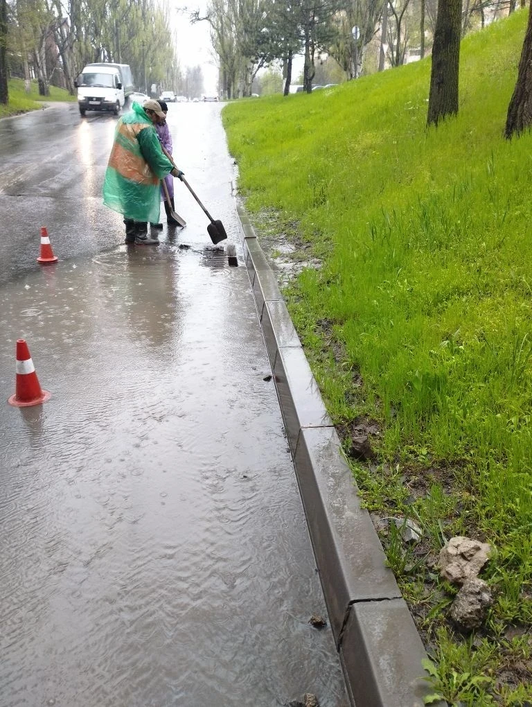 С утра Мариуполь накрыл сильный ливень. На участки улично-дорожной сети, находящиеся в низинах, оперативно вышли сотрудники МБУ «Мариупольавтодор».