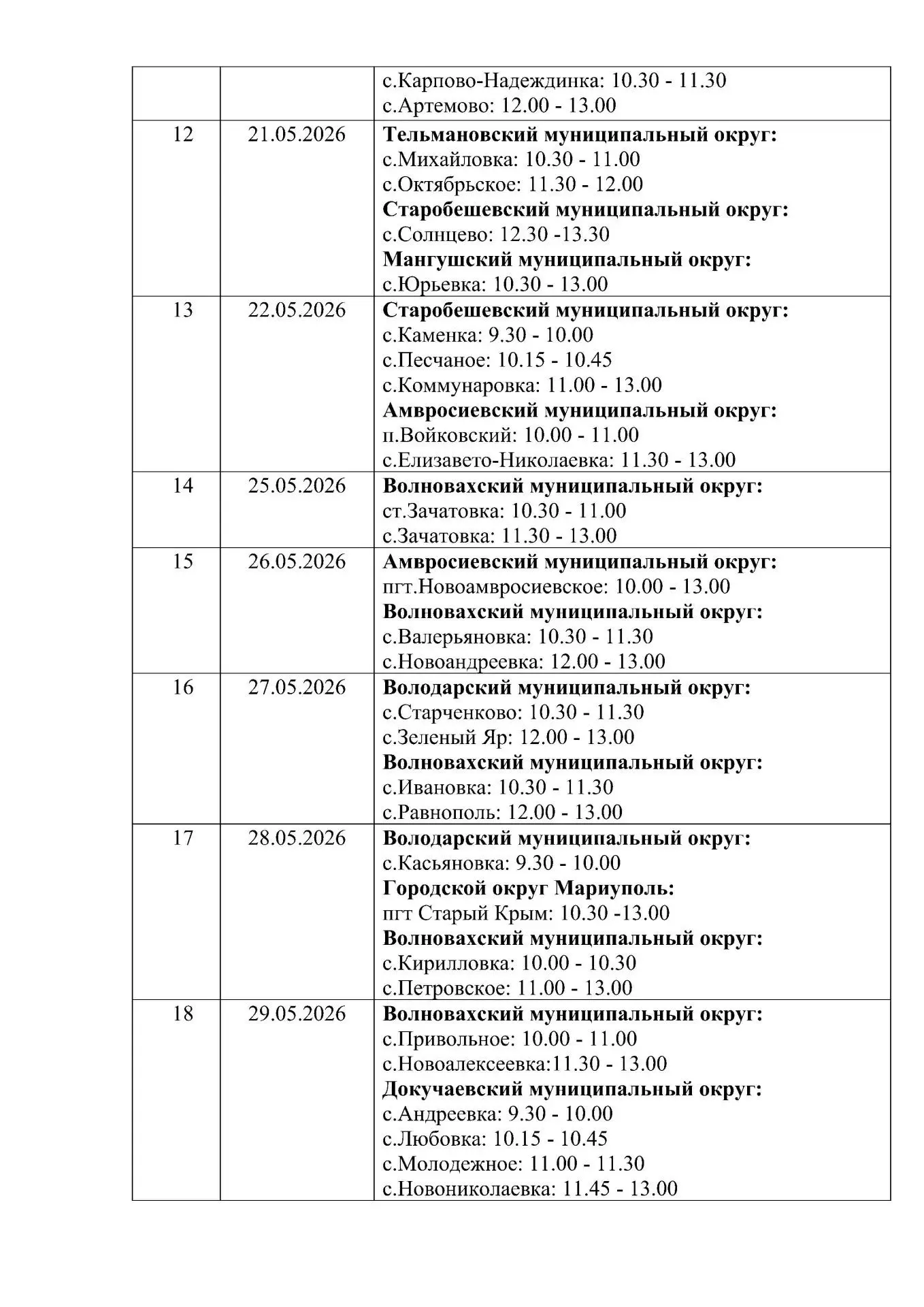 Минздравом ДНР утвержден график выезда автоаптеки на май в населенные пункты городских округов Донецк, Мариуполь, Макеевка, Дебальцево, Енакиево, Торез, а также в Амвросиевский, Волновахский, Володарский, Докучаевский, Мангушский, Новоазовский, Старобешевский, Тельмановский, Шахтерский и Ясиноватский муниципальные округа.