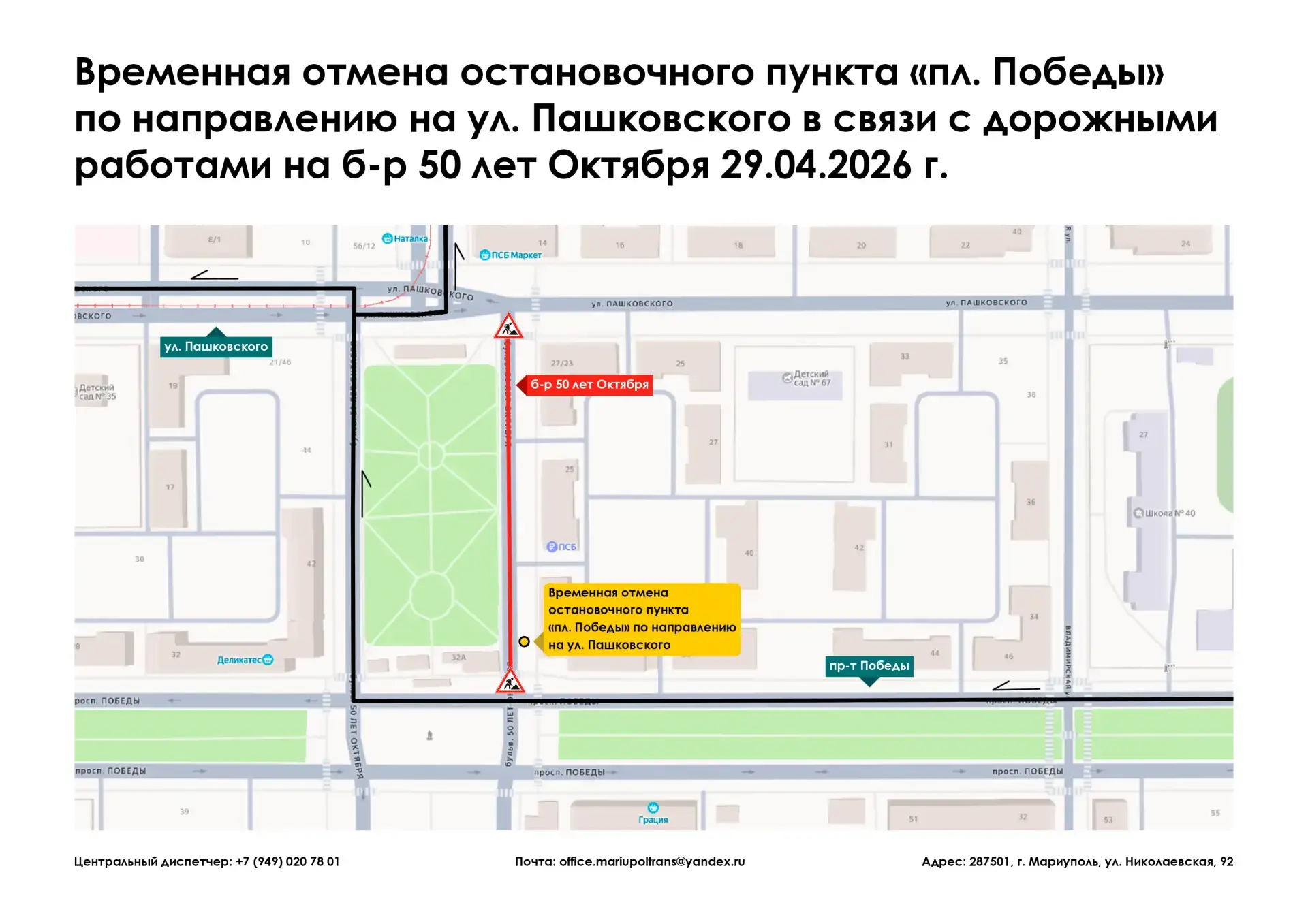 Информируем, что 29.04.2026 г. в связи с дорожными работами на б-р 50 лет Октября, остановочный пункт «пл. Победы» по направлению на ул. Пашковского временно отменяется.