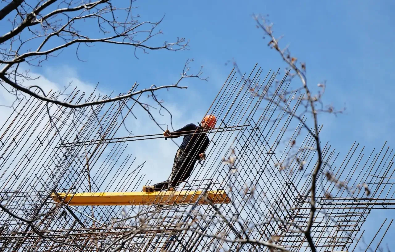 Ему, наверное, страшно? Строитель, коих в Мариуполе тысячи, идет по перекладине на высотных уровнях во время строительства ипотечного дома по бульвару Хмельницкого